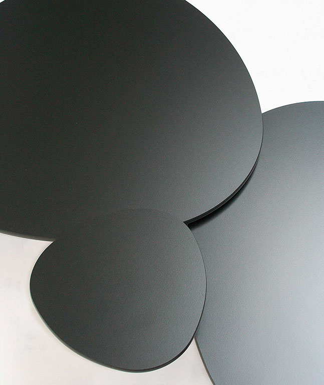 Table basse intérieure et extérieure avec plateaux en stratifié compact, et uniquement intérieure avec plateaux en chêne lamellé collé.