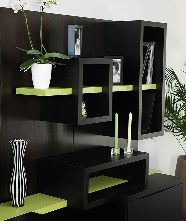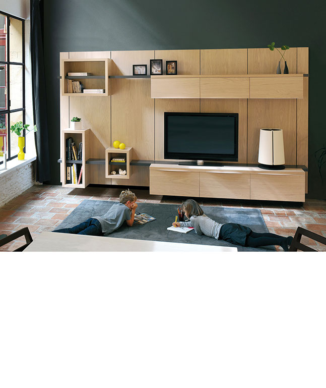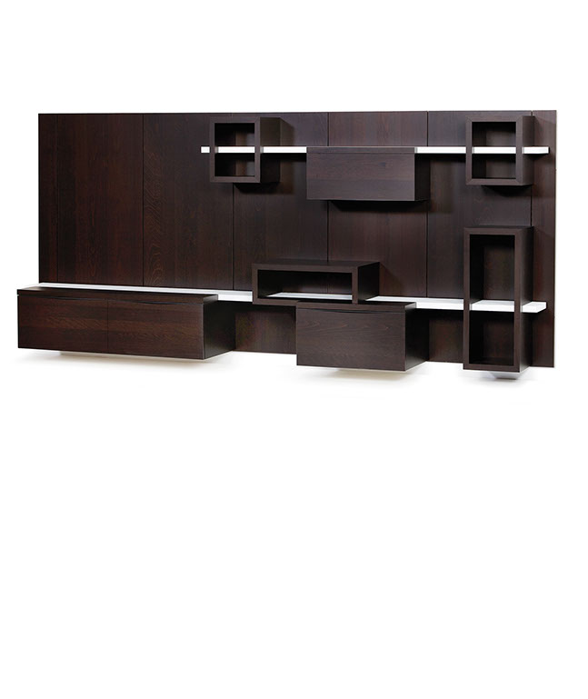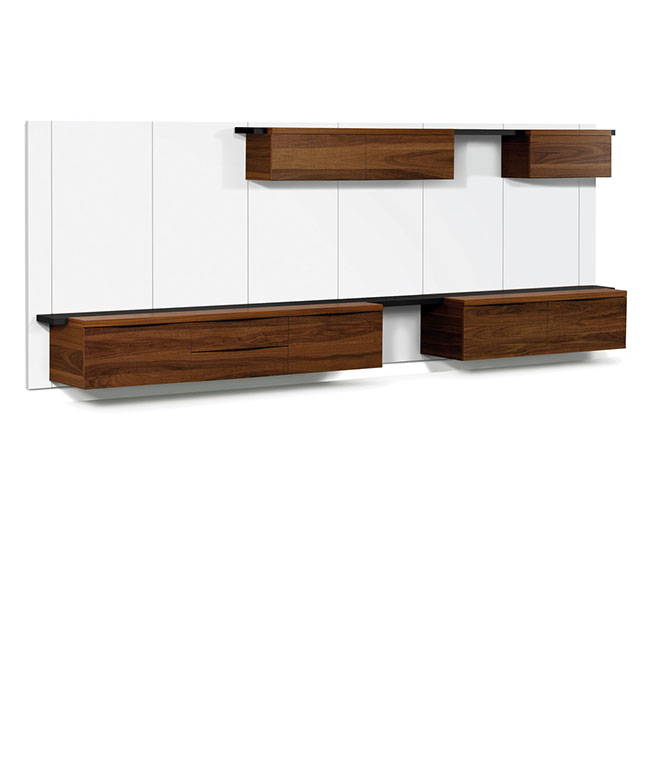 Composer librement Easywall en choisissant le nombre de panneaux, le type de meubles et la couleur des étagères.