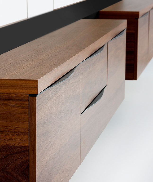 Les meubles reliés entre eux par des étagères, se fixent très simplement sur la façade composée de 2 panneaux minimum, voire à l’infini.