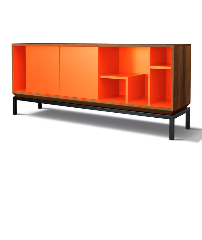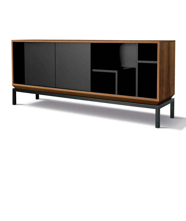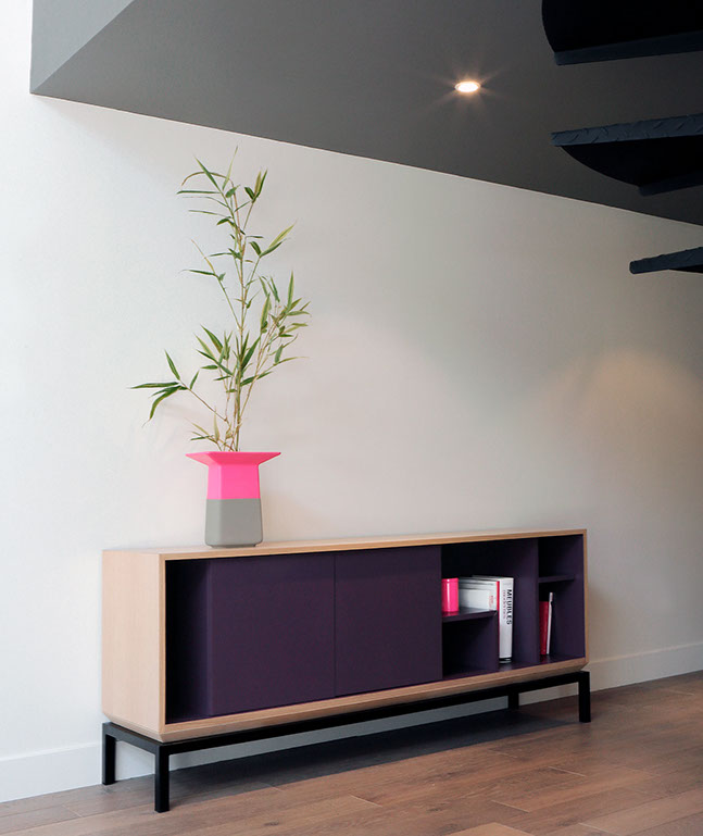 Le bahut MyCity joue sur le mariage du bois, noyer ou chêne et de la couleur en donnant à chacun sa force.
