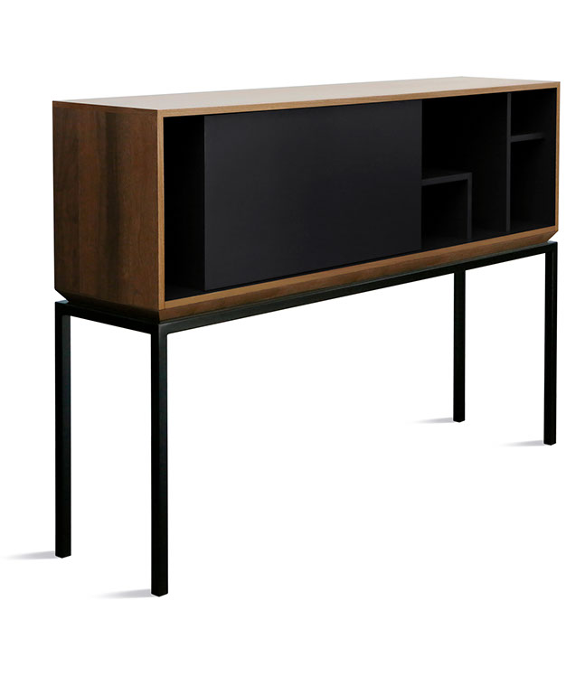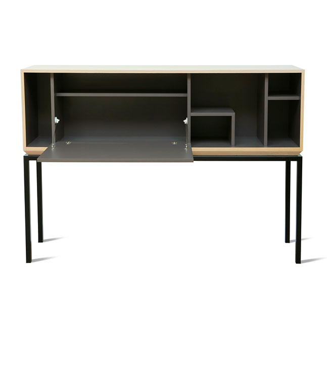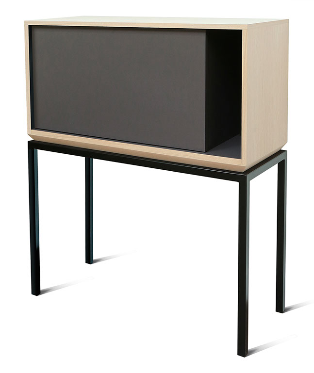 Réalisée en panneaux plaqués de bois naturel vernis et panneaux MDF laqués.