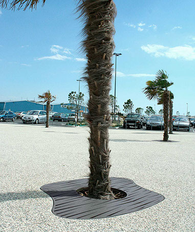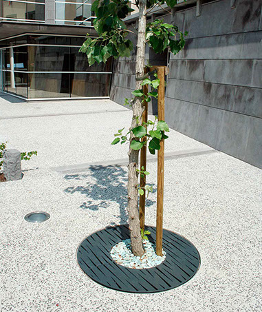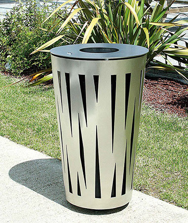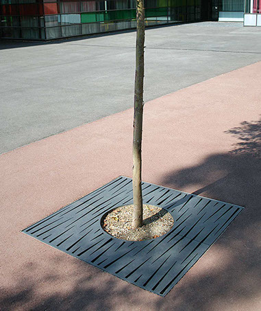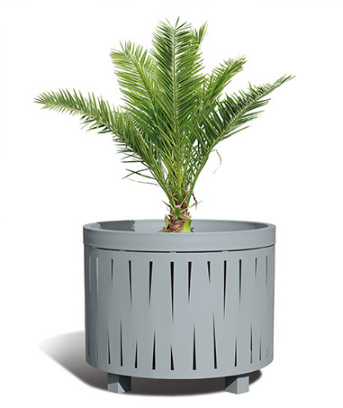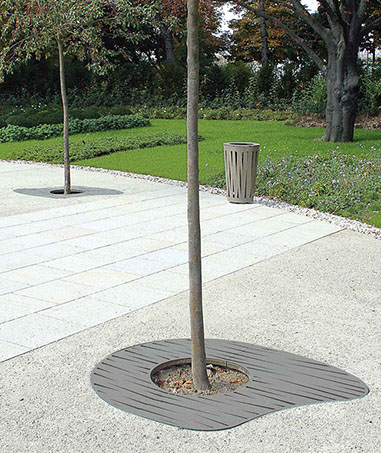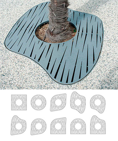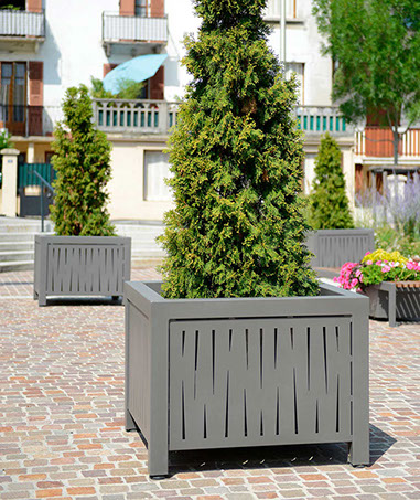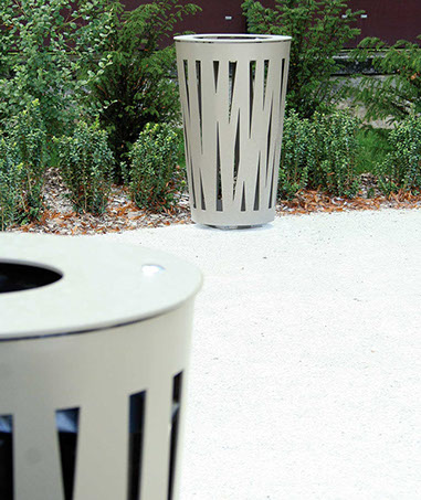 Le dessin des ouvertures découpé au laser dans les parties visibles des produits caractérise la ligne Évolution. Elle se décline en jardinière, corbeille, cendrier et grilles d'arbres.
