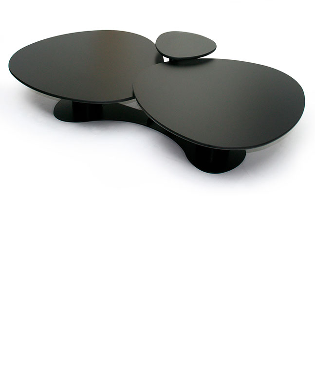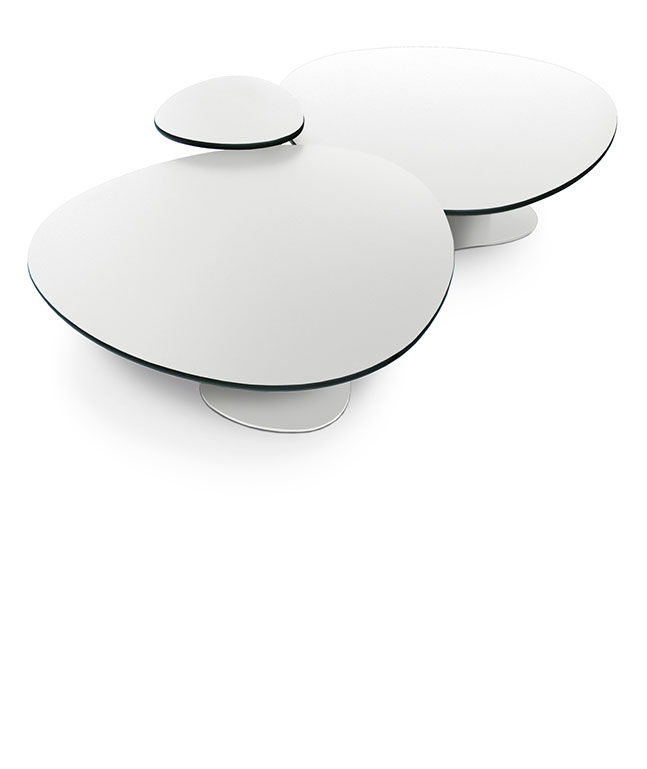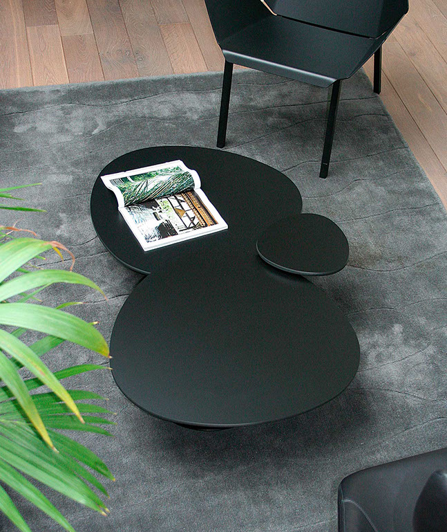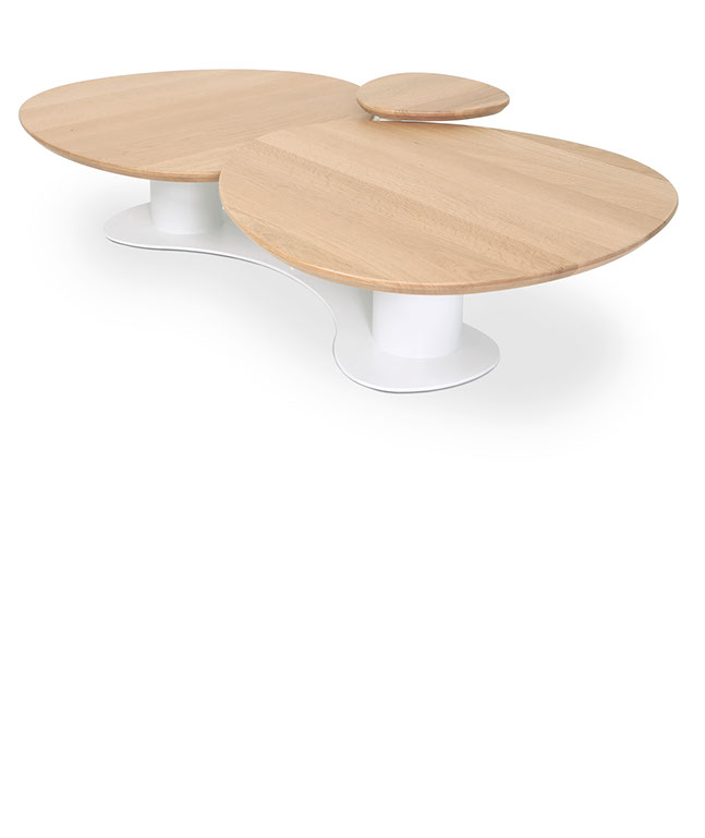 Table basse intérieure et extérieure avec plateaux en stratifié compact, et uniquement intérieure avec plateaux en chêne lamellé collé.