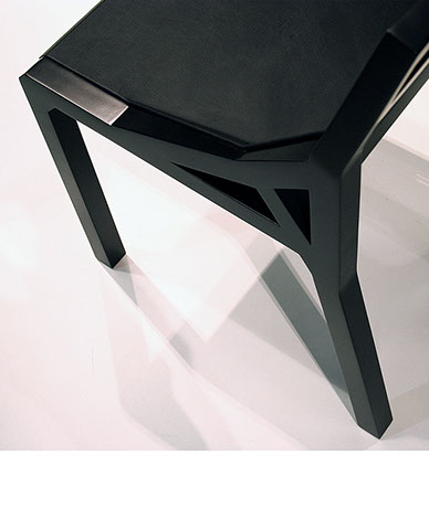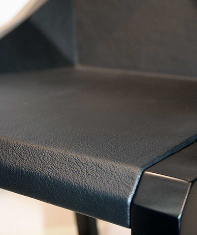 Le châssis est réalisé en hêtre massif laqué et l’assise en tôle aluminium revêtue de cuir.